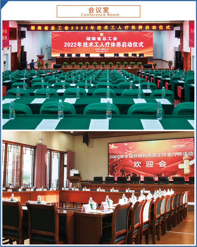 這里設施完備,環(huán)境優(yōu)美。占地70余畝,建筑面積23000余平方米,由多座湘西民族風格的園林建筑群組成。院外依山傍水,院內綠樹成蔭,環(huán)境優(yōu)美怡人,F(xiàn)有客房4棟,各類客房279間,中西餐廳可滿足500人同時就餐。大小多功能會議室、棋牌室、健身房、藍球場、羽毛球場等設施均有配備。