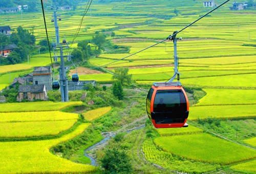 天門山索道途經(jīng)的美麗田園 天門山索道最大的亮點就是它的爬坡面支架的設(shè)計 ,這個支架共有壓索輪96個,托索輪16個,它綜合了現(xiàn)代物理學(xué)、現(xiàn)代工程學(xué)、現(xiàn)代制造業(yè)中最先進的理論和成果,應(yīng)用了世界最先進的索道技術(shù),從而使這段索道總給人一種蕩氣回腸、氣勢沖天的感覺。