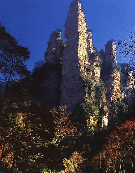 | 金鞭巖:過(guò)“閨門(mén)峰”沿溪而下約500米,有一座高約400米,孤標(biāo)直立,雄奇挺拔的奇峰,名金鞭巖。金鞭巖是武陵源著名景點(diǎn),峰體上細(xì)下粗,四棱分明。棱面布滿節(jié)理橫紋,形成鞭節(jié),渾如一根豎插大地的長(zhǎng)鞭。每當(dāng)夕陽(yáng)晚照,鞭身涂金,熠熠閃光,瑰麗奪目,構(gòu)成一幅奇特壯美的“夕陽(yáng)金鞭圖”。
