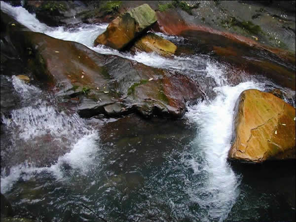| 紫草潭位于張家界國家森林公園內(nèi),金鞭溪與砂刀溝匯合處。潭谷為紫紅色砂巖,因流水經(jīng)多次沖刷成槽狀,而名為紫草潭。潭長約8米,寬約2米,深2米。潭水清澈見底,加之因奇峰、綠樹、紫石映入潭底,斑駁陸離,水光鱗鱗,綠影搖曳,極為自然和諧。潭上小橋為一塊完整的天然巨石,三米多長,二米寬。