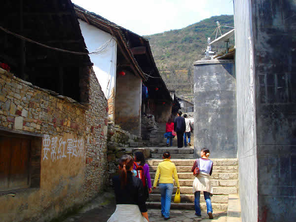 苦竹寨 賀龍在桑植革命時期,幾乎踏遍了澧水兩岸的山山水水,村村寨寨。苦竹寨是澧水邊的一座少數(shù)民族雜居的村落,保留了明清時的建筑特色,民風淳樸,村民能歌善舞,許多桑植民歌都是靠苦竹寨的歌手流傳的。入夜的時候,苦竹寨亮起了盞盞紅燈,這是村里的一個傳統(tǒng)。當年紅軍夜行軍過苦竹寨的時候,村里有個老婆婆怕紅軍夜黑路難走,便在家門口懸起了一盞紅燈,其它村民爭相效仿,苦竹寨成了一個燈的世界。這段軍民魚水情被寫成了歌,傳唱到現(xiàn)在,這就是《門前掛盞燈》。
