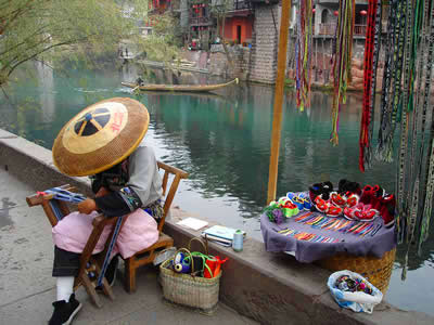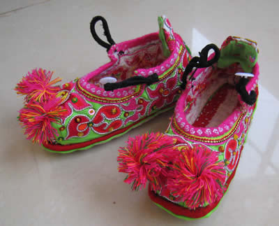 刺繡 刺繡。是土家姑娘在直紋平布上,按照布紋的經(jīng)緯和預(yù)先繪畫的花樣與底色不同的絲線繡成圖案。舊時(shí)姑娘們穿的繡花衣服,繡有服飾花邊、胸花、帽花,此外繡花枕頭、繡花荷包等也是精巧的手工工藝品。土家刺繡在配色上有自己的講究與習(xí)慣,一般選用青、藍(lán)、大紅等深色布料作底布,用淺色繡線制作圖案,或者相反,兩種用法的結(jié)果使繡品顯得質(zhì)樸逼真,色澤鮮艷,對(duì)比強(qiáng)烈。傳統(tǒng)圖案有“花開(kāi)富貴”、“龍鳳呈祥”、“鴛鴦戲水”、“喜鵲鬧梅”、“松鶴同壽”等,分室內(nèi)、衣著、工具、行李裝飾等多種種類。在景區(qū),土家婦女邊繡邊賣的精美鞋墊,深受海內(nèi)外游客喜愛(ài)。
