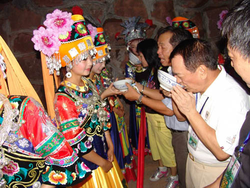 祝賀詞和答謝詞之后,主人把早已想好了的農(nóng)事或家事其日常生活的要事向來客提問,接謝人隨問隨答,然后由族長十分恭敬地雙手舉起盛滿包谷酒的酒杯,遞給一個年長客人,一碗一碗地讓客人們喝下這香醇美的包谷燒酒。一切儀式做完之后,說聲:“得罪了,最尊貴的客人”,客人答一聲“請不要客氣,我們都是一家人”。這時,酒門大開,攔門人很禮貌地讓開一條道路恭迎客人進屋。