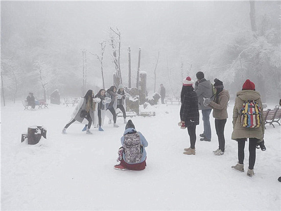 山頂上樹林不見了,取而代之的是形態(tài)各異的雪凇、冰掛;林間游道上覆蓋了厚厚的白雪,踩上去咯吱作響;絕壁上的棧道雪白一片,仿若是一條仙境之路...游客們玩雪、賞雪不亦樂乎。