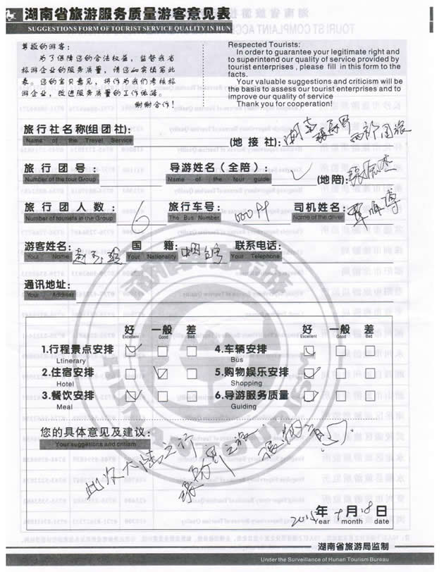 5月份,臺(tái)灣趙女士一行6位貴賓與湖南西部(張家界)中國國際旅行社工作人員——小龔取得聯(lián)系,經(jīng)過商談,雙方達(dá)成協(xié)議并簽訂旅游合同,于9月12日抵達(dá)張家界,開始張家界之旅。此次行程是由我社優(yōu)秀導(dǎo)游——張杰負(fù)責(zé)旅游接待工作,張導(dǎo)在旅游過程中講解詳細(xì),客人也很滿意,在意見表上寫道:此次大陸之行、張家界之旅、很滿意。同時(shí)也感謝趙女士一行貴賓選擇湖南西部(張家界)中國國際旅行社,以及您對(duì)湖南西部國旅的信任與支持。我們會(huì)繼續(xù)努力,做好旅游接待工作。期待下一次與您的合作,祝您愉快!