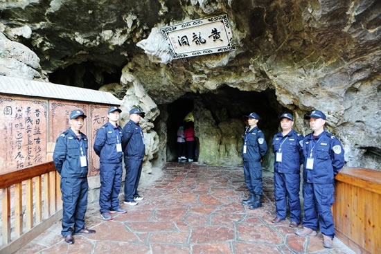 保護重于利用,開放服從保護。4月16日一大早,筆者在黃龍洞景區(qū)看到,一支英姿颯爽的保安隊伍邁向洞內(nèi)各自指定的崗位。