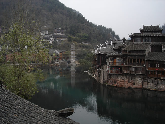 【鳳凰古城位于沱江之畔、群山環(huán)抱、關(guān)隘雄奇、碧綠的沱江依著城墻緩緩流淌,疊翠的南華山麓倒映江中,江中漁舟游船數(shù)點,山間暮鼓晨鐘兼鳴,懸崖上的吊腳樓輕煙裊裊,碼頭邊的浣紗姑笑聲朗朗,兩岸已有數(shù)百年歷史的吊腳樓更是別有一番風味;順水而下穿過虹橋一幅江南水鄉(xiāng)的畫面便展現(xiàn)于眼前--萬壽宮、萬名塔、奪翠樓……一種遠離塵世的感覺悠然而生;鳳凰--猶如“一幅濃墨淺彩的中國山水畫”】,入住酒店。